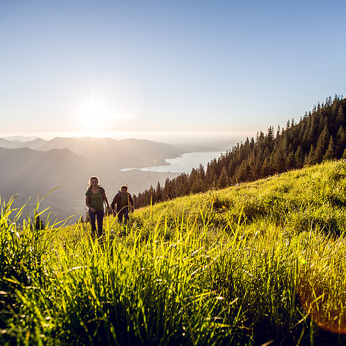 Unten glitzert der Tegernsee, rundherum erstrecken sich grüne Wiesen, Wälder und sanfte Hügel bis zum Horizont. Doch über Ihnen winkt das Gipfelkreuz. Ein Wanderurlaub in Bayern ist das Richtige für Sie, wenn Sie sich nach idyllischer Natur, authentischer Gastfreundschaft und gesunder Bewegung sehnen. Rund um unser Wanderhotel am Tegernsee finden bestimmt auch Sie die passende Tour.