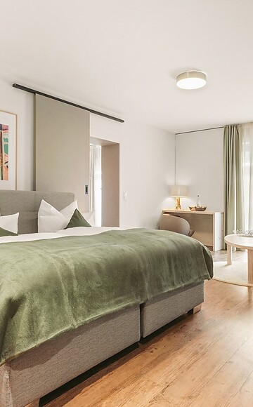 In unserem Deluxe Doppelzimmer (ca. 48 qm) ist Entspannung vorprogrammiert. Genügend Freiraum und eine Whirlpool-Badewanne sorgen für die perfekten Voraussetzungen die Alltagssorgen zu vergessen.