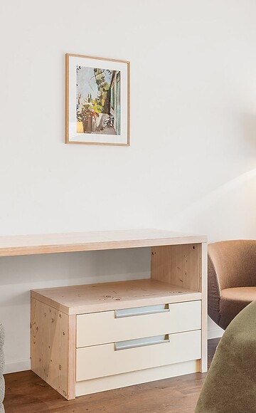 Unsere Einzelzimmer (ca. 26 qm) mit offenem Bad laden zum Erholen und Entspannen ein. Natürliche Dekorationselemente, ein warmes Farbkonzept und unsere hochwertigen Boxspringbetten sind ein Balsam für die Seele.