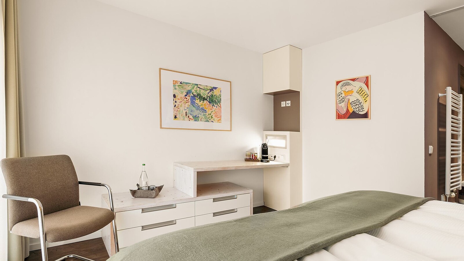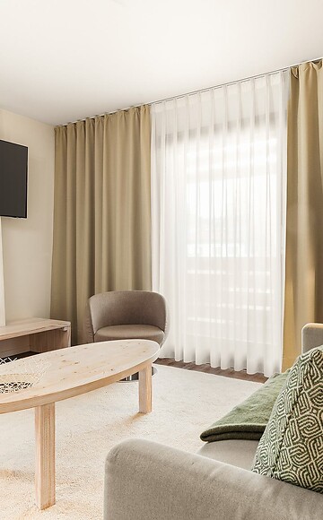 Unsere Junior Suite (ca. 48 qm) biete Raumgefühl ganz nach Ihrem Geschmack. Ein großzügiger Wohnbereich und ein Schlafbereich mit offenem Bad sorgen in Kombination mit warmen Farben und natürlichen Materialien für eine Entspannungsgarantie.