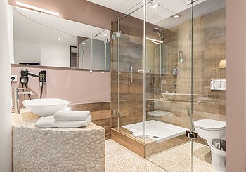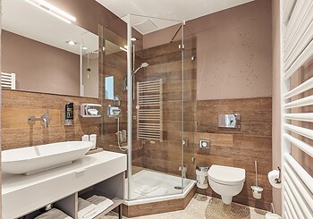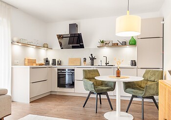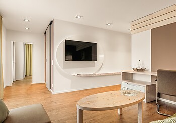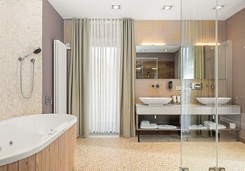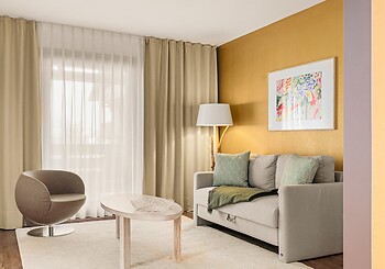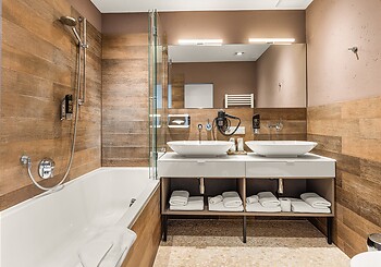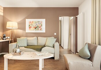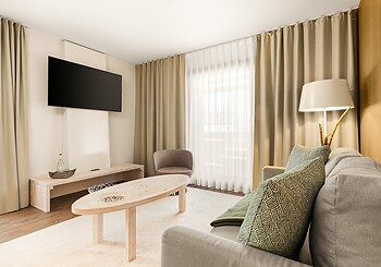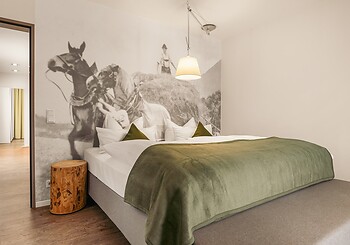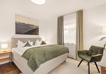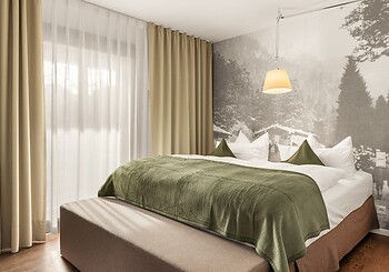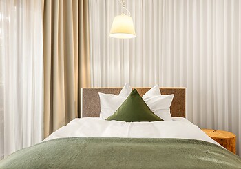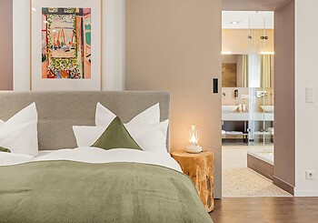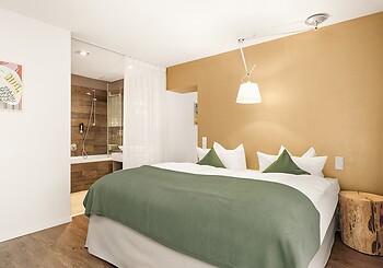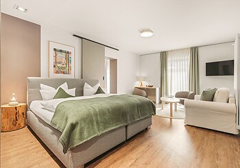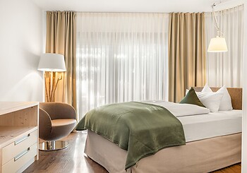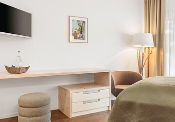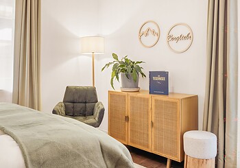 Bright, spacious, modern and straightforward, yet always cosy, with high-quality materials and distinctive colourful accents -welcome to our rooms. Choose between single rooms, various double rooms and suites, as well as our holiday apartment with fully equipped kitchen, which is particularly popular with families. Every room features free Wi-Fi, shower and/or bathtub, premium toiletries, a generous balcony or terrace. Refreshing drinks and snacks are available at any time of day in the fridge and at the coffee station in the fireside lounge.