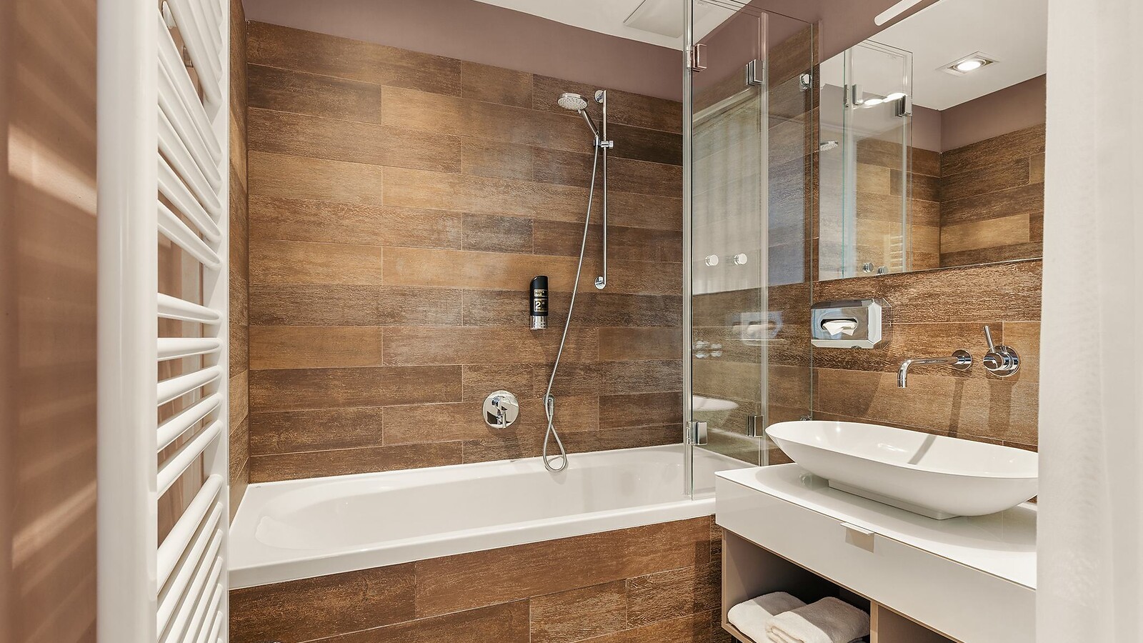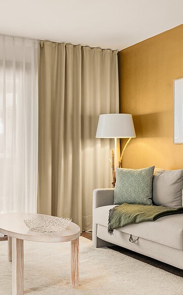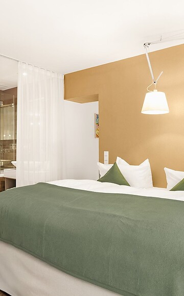 Our Junior Suite (approx. 48 m²) offers a spacious atmosphere tailored to your taste. A generous living area and an open-plan sleeping area with integrated bathroom, combined with warm colors and natural materials, guarantee pure relaxation.