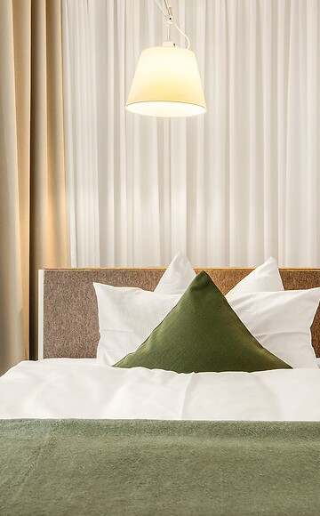 Our single rooms (approx. 26 m²) with an open-plan bathroom invite you to relax and unwind. Natural decorative elements, warm color tones, and our high-quality box-spring beds are pure comfort for the soul.